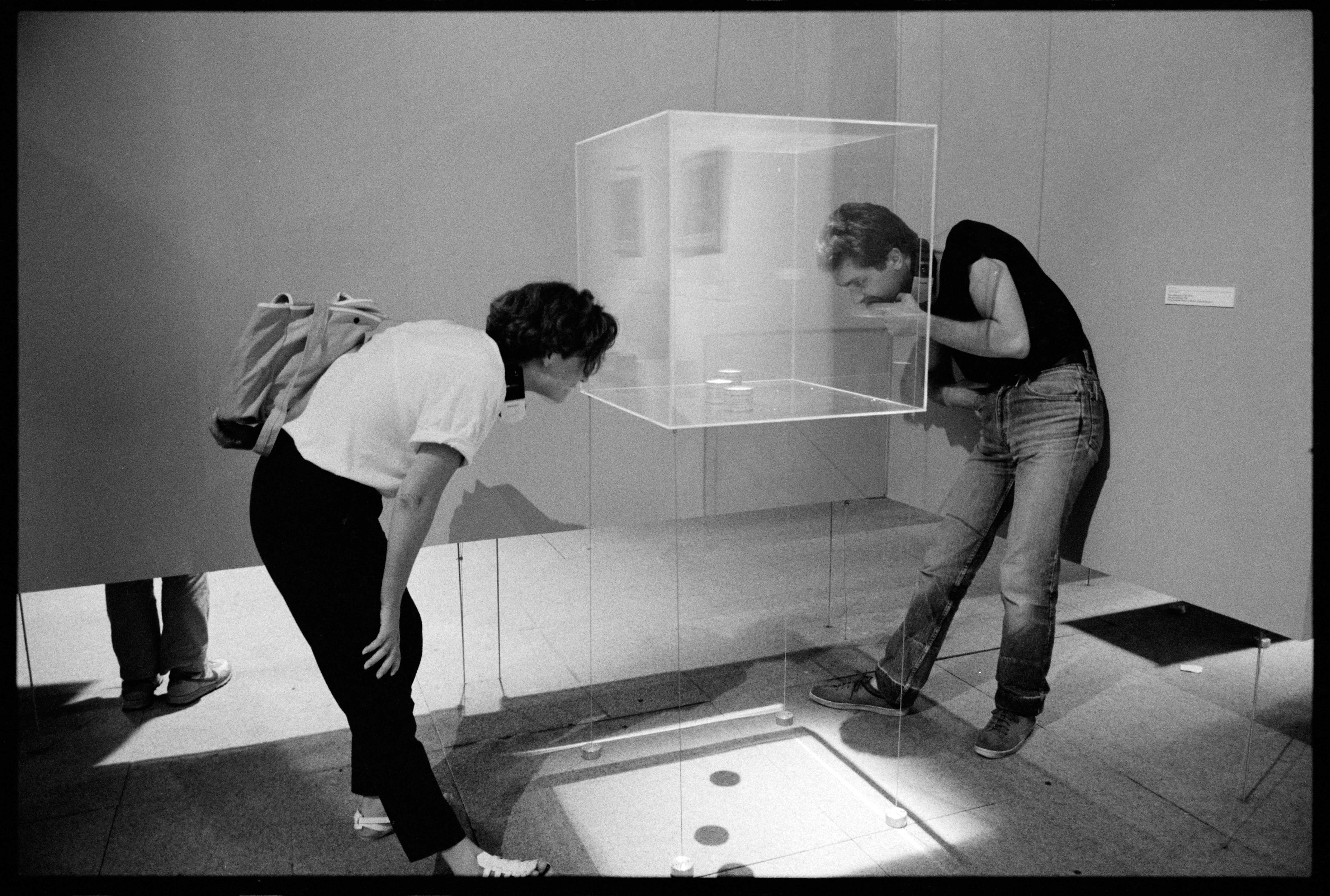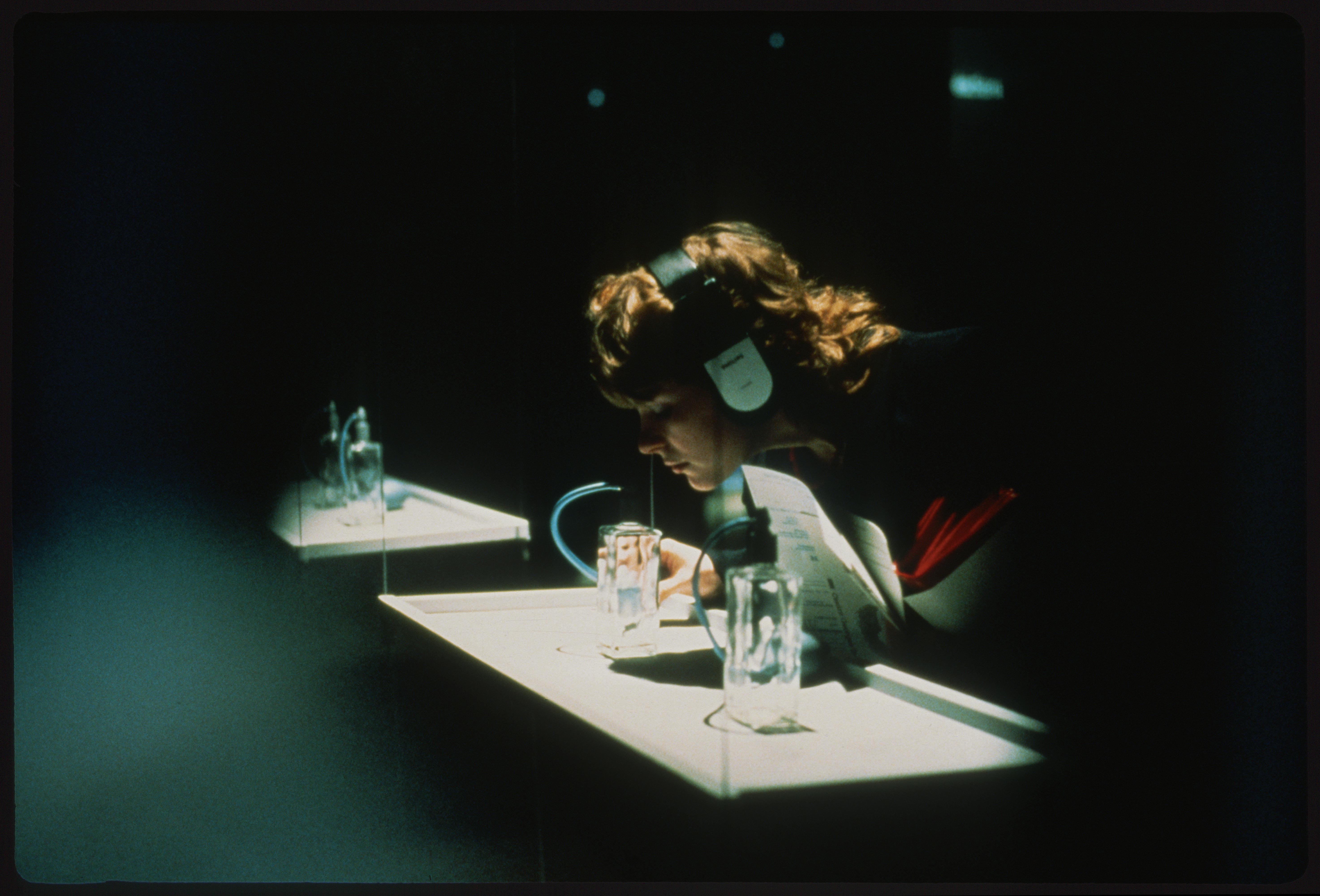 Headphones enabled visitors to listen to soundtracks which included readings of literary, philosophical, and poetic texts that were accompanied by electronic music. By means of infrared technology, the movement through the exhibition space triggered the switching of channels. These soundtracks enriched the exhibition with additional auditive associations and elements of disruption.