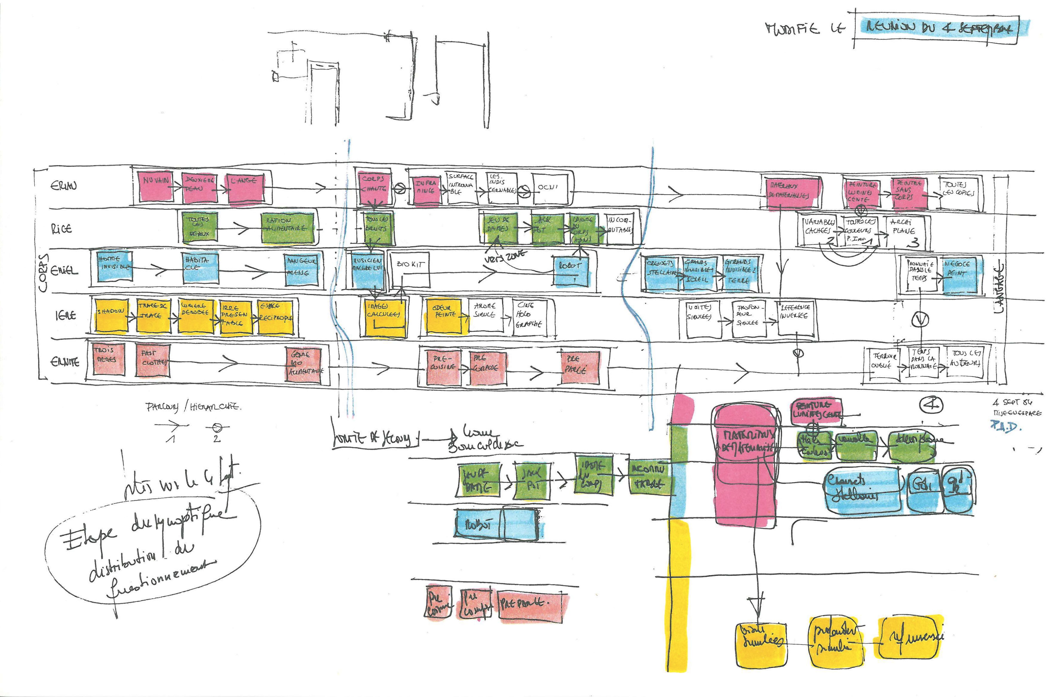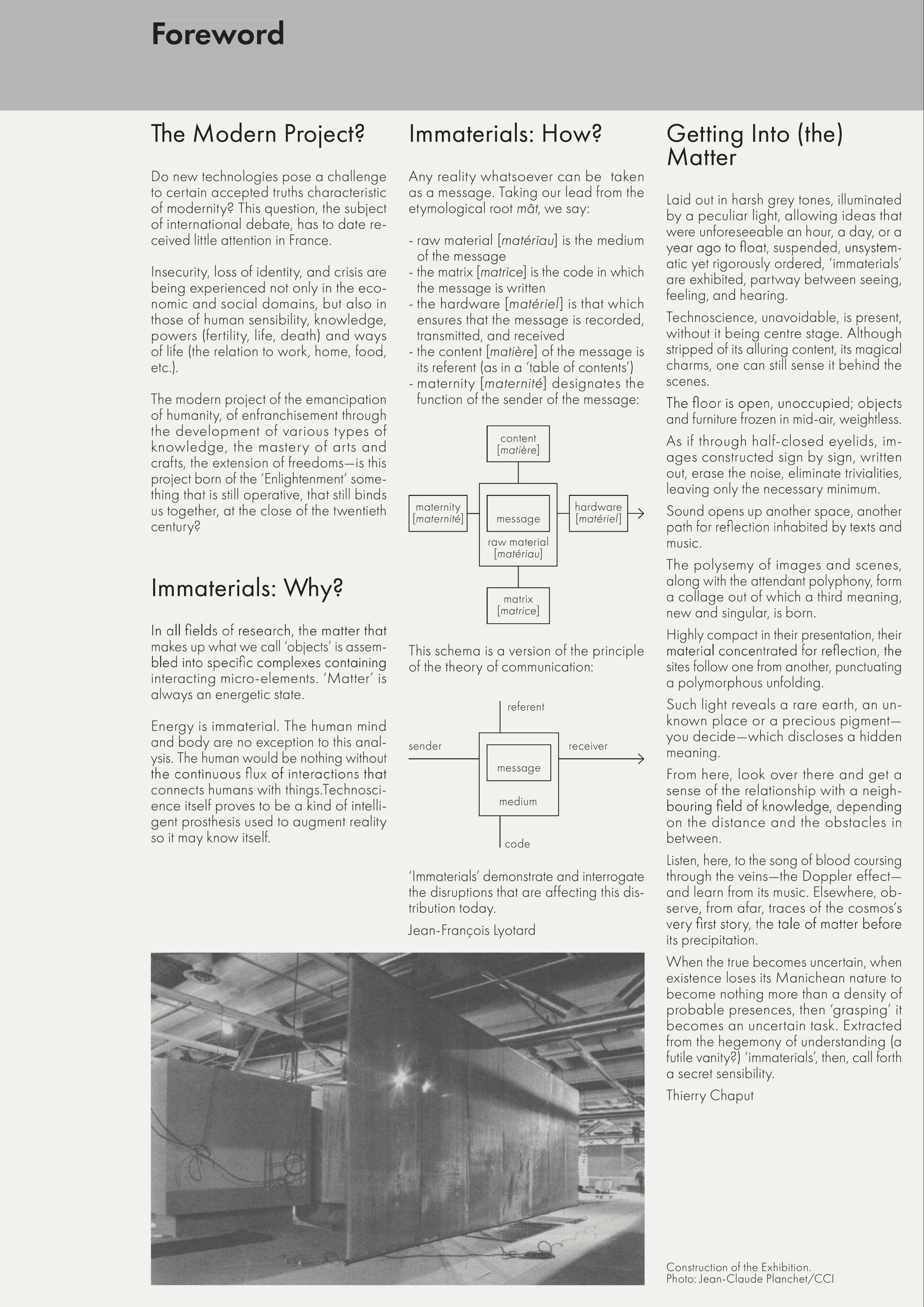 Les Immatériaux consisted of 61 sites spread across the fifth floor of the Centre Pompidou which were divided among five paths: matériau [material]; matrice [matrix]; matériel [hardware]; matière [matter]; maternité [maternity]. The theme of each path derived from the shared etymological root “mât”, which refers to making by hand, measuring, or constructing.